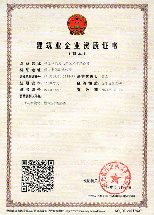 2016年4月,天河電子取得河北省住房和城鄉(xiāng)建設廳頒發(fā)的建筑智能化工程專業(yè)承包貳級資質。