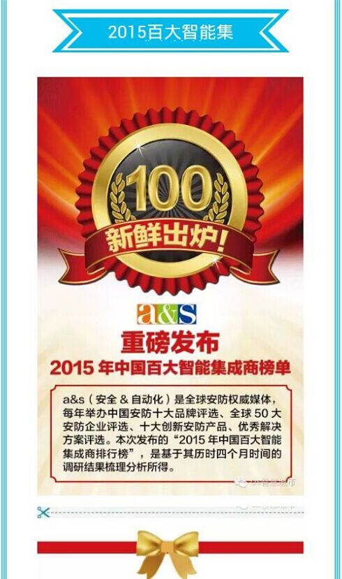 由安全&自動化雜志承辦,工信部下屬中國電子學(xué)會信息系統(tǒng)集成分會主辦的第一屆百大智慧安防集成商評選活動,吸引了來自智能化產(chǎn)業(yè)的超過200位高端嘉賓參會,包括政府部門、國內(nèi)外知名智能化企業(yè)以及智能化產(chǎn)業(yè)的專家、學(xué)者、企業(yè)高管、技術(shù)總監(jiān)等,經(jīng)過長達(dá)4個月的角逐,我公司從評選活動的6萬名智能集成商中脫穎而出,獲得“2015中國百大智能集成企業(yè)”的榮譽(yù) 。a&s(安全&自動化)是全球安防權(quán)威媒體,每年舉辦全國安防十大品牌評選、全球50大安防品牌評選、十大創(chuàng)新安防產(chǎn)品、優(yōu)秀解決方案評選。本次發(fā)布的“2015年中國百大集成商排行榜”是經(jīng)過四個月調(diào)研結(jié)果梳理分析所得。