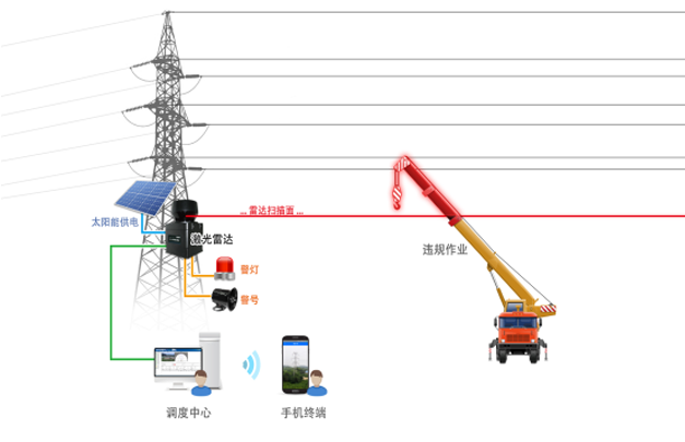 天河電子基于激光雷達的架空輸電線路防護系統(tǒng),旨在彌補視頻監(jiān)控技術(shù)、傳感器報警技術(shù)被動防御的特性和智能圖像分析技術(shù)在環(huán)境應(yīng)用中的局限性,利用激光雷達主動防御的特性,結(jié)合高清視頻監(jiān)控技術(shù),對闖入電力高壓線下3-5米目標(如違章作業(yè)吊車)進行定位、跟蹤、放大,現(xiàn)場警示違章作業(yè)人員,同時上傳告警視頻或圖片給監(jiān)管單位進行相應(yīng)警情處置。